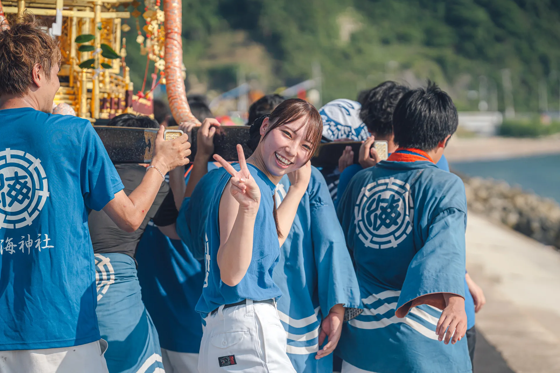 浴衣姿の女性がキリコを担ぐことでも知られている西海祭り。祭り唄で盛り立てながらキリコがいく姿は印象的で、海風と西陽が混ざり合う夕暮れの時間は特別だ。キリコや神輿の乱舞の迫力は圧巻で、西海は今年も熱気に包まれていた。